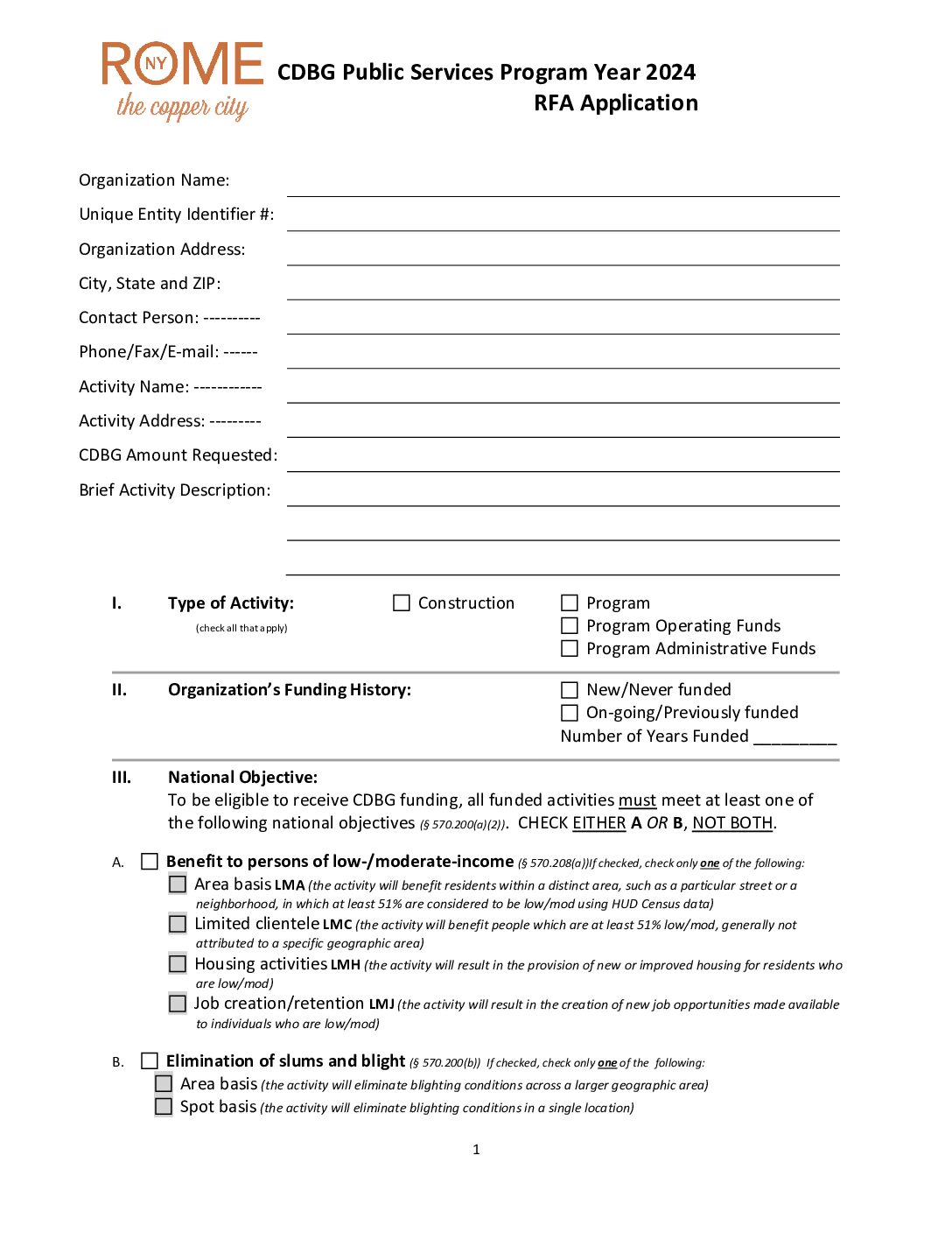 View Larger Image Public Service RFA – PY 2024 Preview Filename: CDBG_Public-Service_RFA_PY_2024.pdf File Type: pdf File Size: 1 MB Categories: Community Development Block Grant By Admin|2026-02-03T14:06:45-05:00February 3, 2026|Comments Off on Public Service RFA – PY 2024 Share This Story, Choose Your Platform! FacebookXRedditLinkedInWhatsAppTelegramTumblrPinterestVkXingEmail About the Author: Admin
