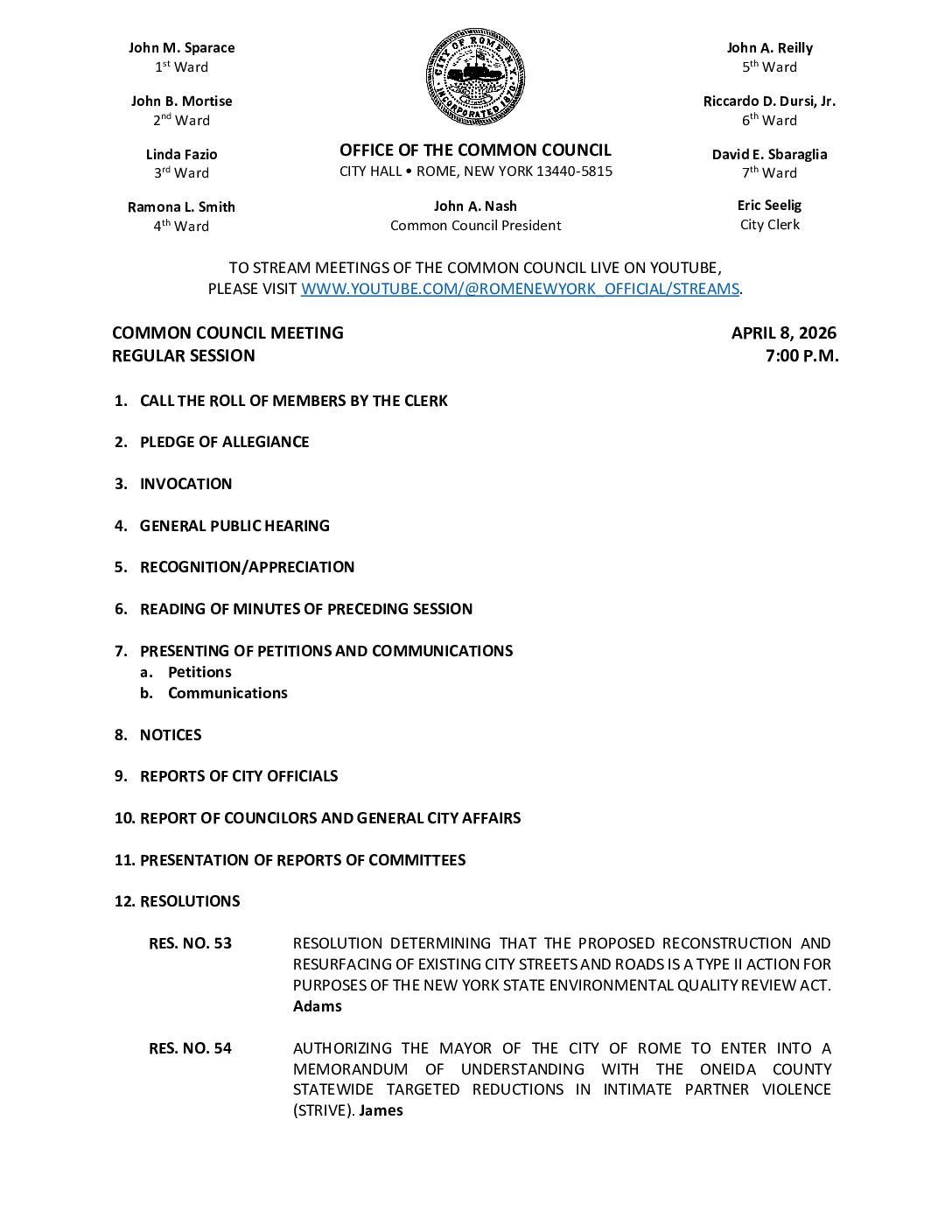 View Larger Image Common Council Agenda 4-8-26 Preview Filename: 4.8.26-CC-Agenda.pdf File Type: pdf File Size: 2 MB Categories: Common Council Agendas By Admin|2026-04-06T14:00:41-04:00April 6, 2026|Comments Off on Common Council Agenda 4-8-26 Share This Story, Choose Your Platform! FacebookXRedditLinkedInWhatsAppTelegramTumblrPinterestVkXingEmail About the Author: Admin