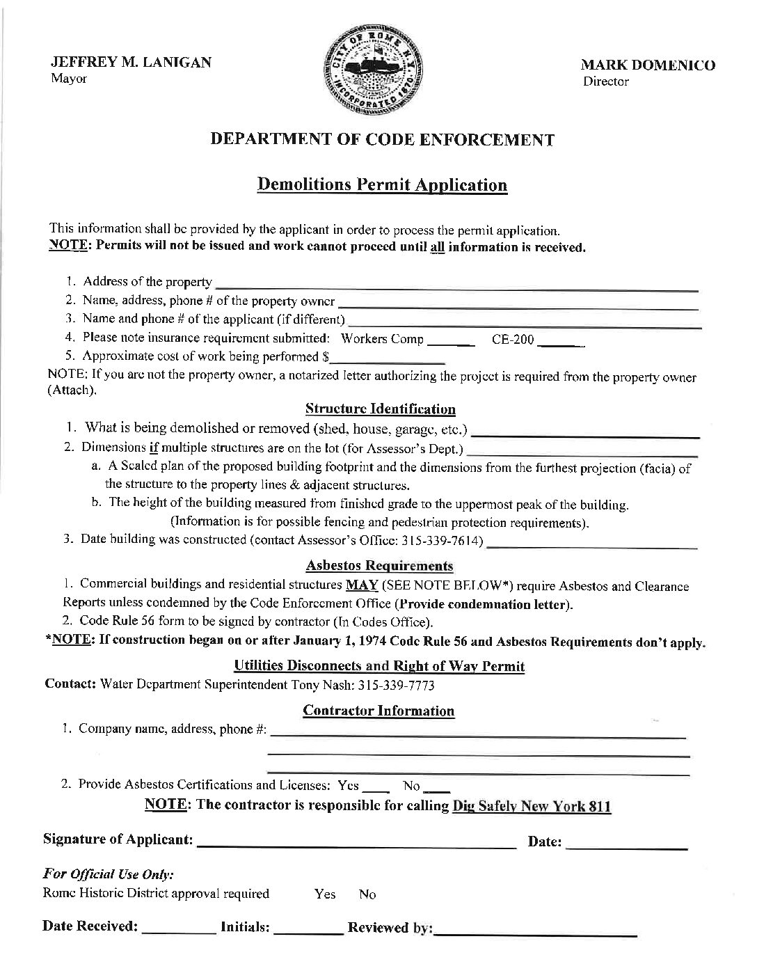 View Larger Image Demolition Permit Application Preview Filename: Demolition-Permit-Application.pdf File Type: pdf File Size: 437 KB Categories: Code Enforcement By Admin|2026-01-09T14:25:02-05:00January 9, 2026|Comments Off on Demolition Permit Application Share This Story, Choose Your Platform! FacebookXRedditLinkedInWhatsAppTelegramTumblrPinterestVkXingEmail About the Author: Admin