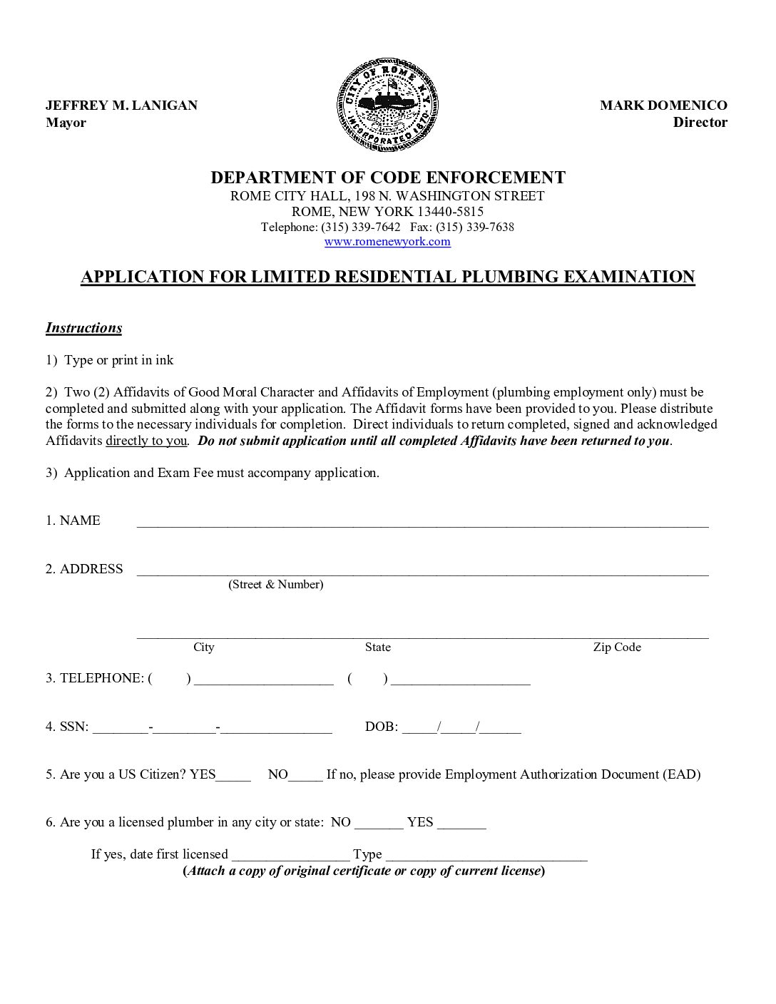 View Larger Image Limited Residential Plumbing Exam Application Preview Filename: Limited-Residential-Plumbing-Exam-Application.pdf File Type: pdf File Size: 165 KB Categories: Code Enforcement By Admin|2026-01-09T14:22:33-05:00January 9, 2026|Comments Off on Limited Residential Plumbing Exam Application Share This Story, Choose Your Platform! FacebookXRedditLinkedInWhatsAppTelegramTumblrPinterestVkXingEmail About the Author: Admin
