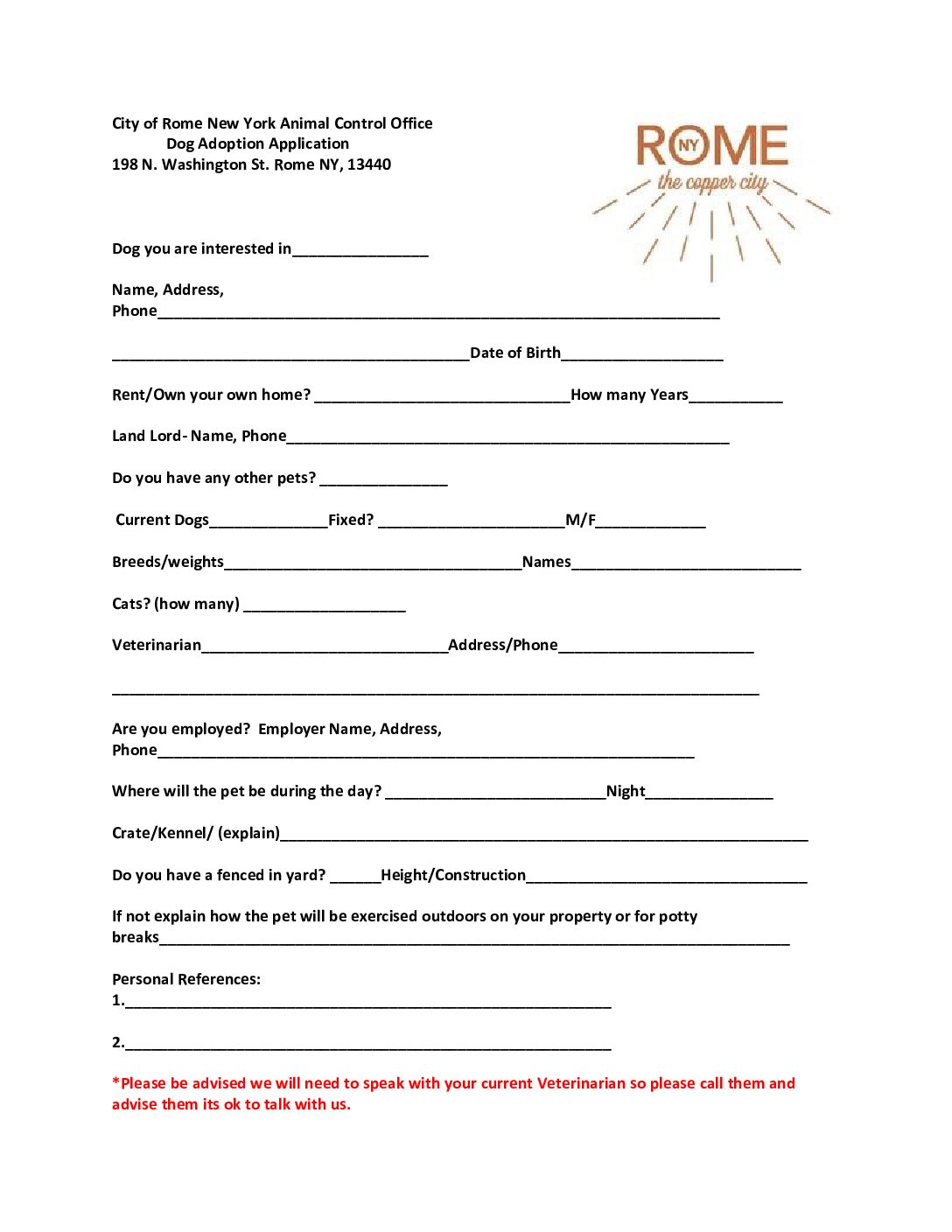 View Larger Image Dog Adoption Application Preview Filename: Public_Safety_Dog_Adoption_Application.pdf File Type: pdf File Size: 52 KB Categories: Animal Control By Admin|2026-02-20T14:03:03-05:00February 3, 2026|Comments Off on Dog Adoption Application Share This Story, Choose Your Platform! FacebookXRedditLinkedInWhatsAppTelegramTumblrPinterestVkXingEmail About the Author: Admin