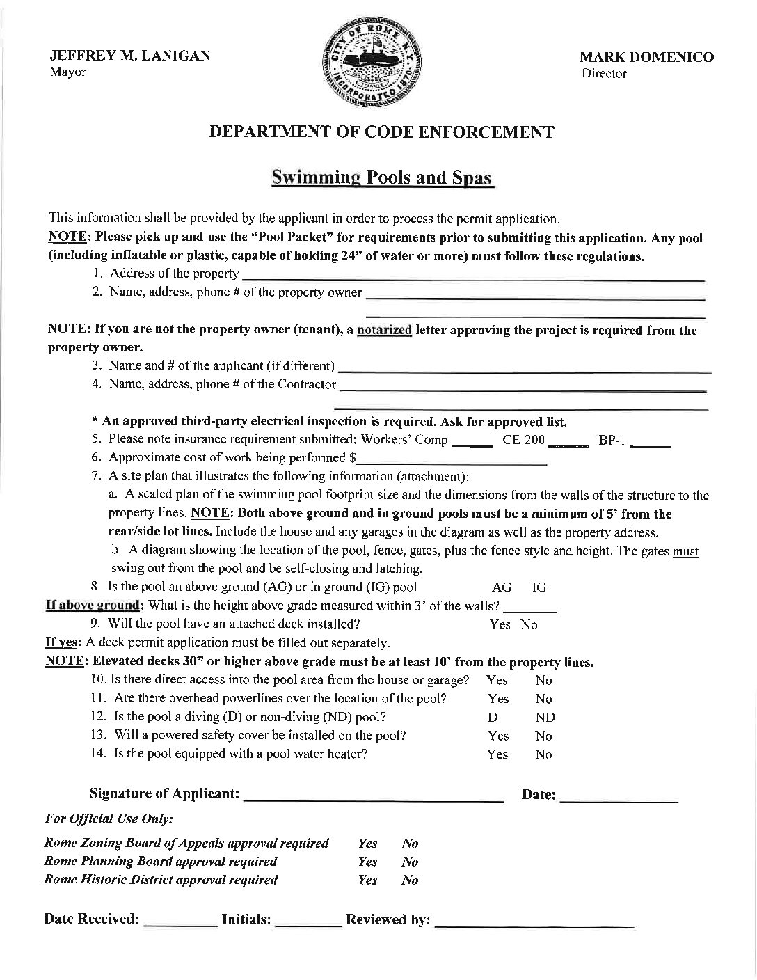 View Larger Image Swimming Pool Permit Preview Filename: Swimming-Pool-Permit.pdf File Type: pdf File Size: 1 MB Categories: Code Enforcement By Admin|2026-01-09T14:29:09-05:00January 9, 2026|Comments Off on Swimming Pool Permit Share This Story, Choose Your Platform! FacebookXRedditLinkedInWhatsAppTelegramTumblrPinterestVkXingEmail About the Author: Admin