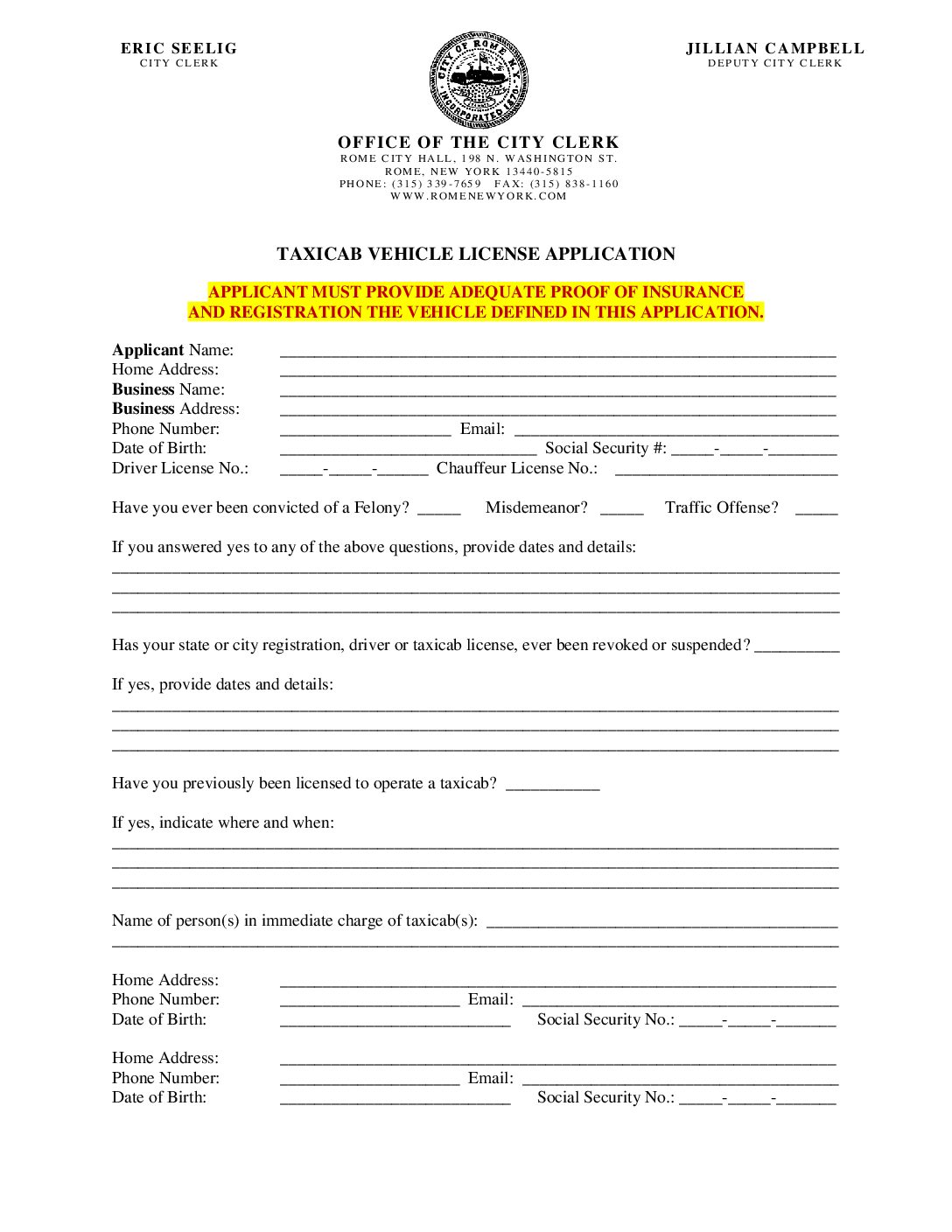 View Larger Image Taxicab Vehicle License Application Preview Filename: Taxicab-Vehicle-License-Application.pdf File Type: pdf File Size: 175 KB Categories: City Clerk By Admin|2026-01-09T13:26:42-05:00January 9, 2026|Comments Off on Taxicab Vehicle License Application Share This Story, Choose Your Platform! FacebookXRedditLinkedInWhatsAppTelegramTumblrPinterestVkXingEmail About the Author: Admin